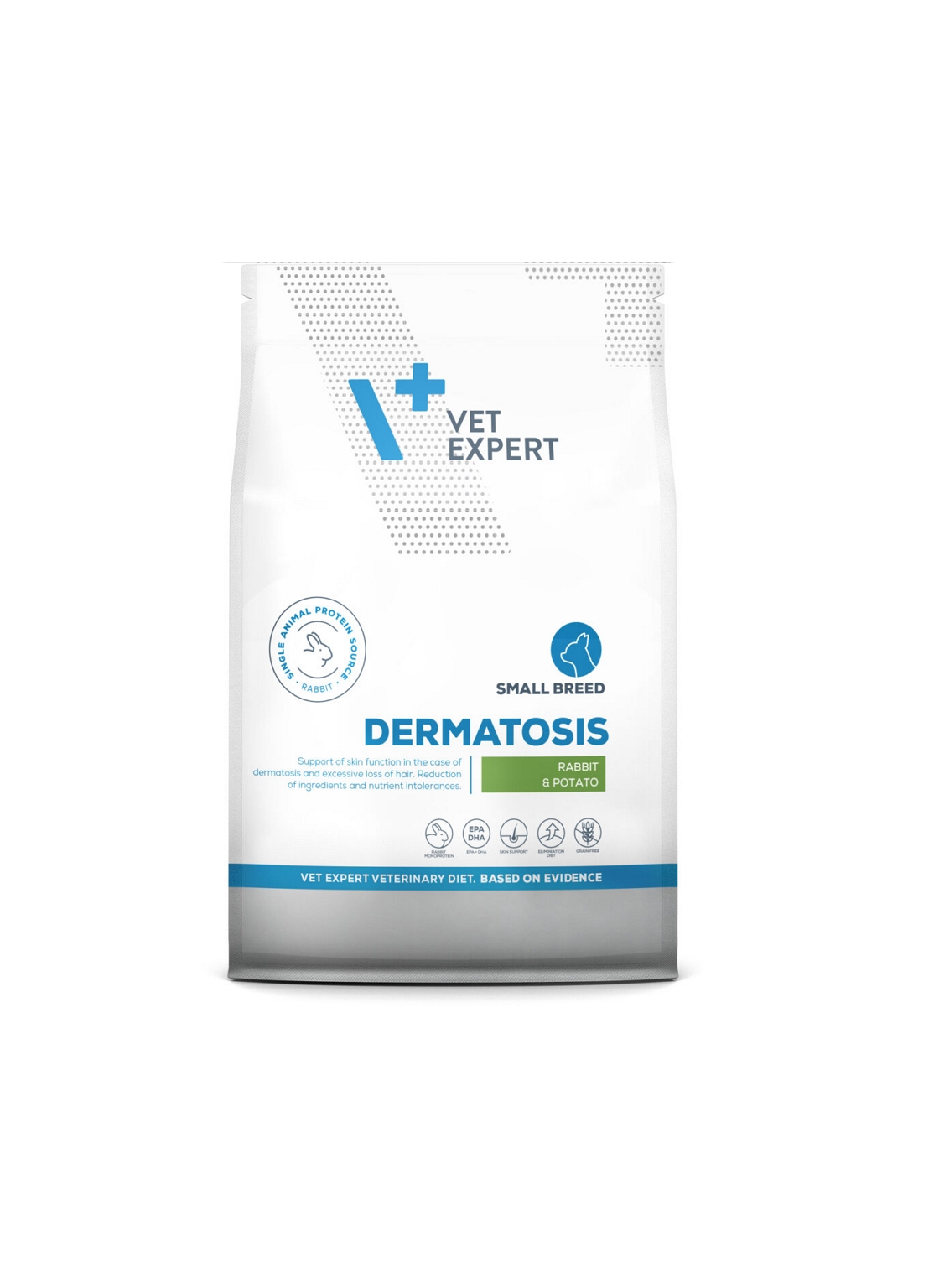 Composition: dehydrated rabbit meat (40%), dried potato pulp (20%), potato protein, poultry fat, dried sugar beet pulp, linseed, yeasts, sodium chloride, sodium polyphosphate (0.3%), potassium chloride, fructo-oligosaccharides (FOS, 1,000 mg/kg), yeasts products (MOS source, 260 mg/kg), Mojave yucca.